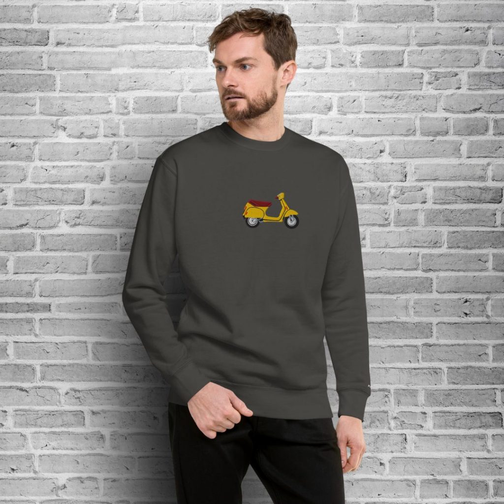 Hochwertig bestickter Unisex-Sweater mit ikonischem Retro-Scooter für alle, die Italo-Vibes mit Komfort kombinieren wollen.